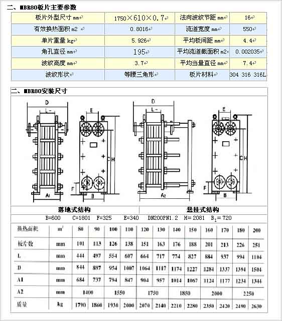 MBR80型板式换热器主要由不锈钢压制的传热片、密封胶垫、夹紧螺栓和压紧板整机框架等零部件组成。具有换热效率高,物料流阻损失小,结构紧凑,温度控制灵敏,操作弹性大,拆装方便,使用寿命长等特点,是目前国内最先进的高效节能换热设备。