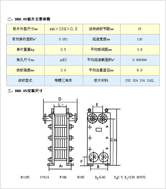 BR0.05型板式换热器主要由不锈钢压制的传热片、密封胶垫、夹紧螺栓和压紧板整机框架等零部件组成。具有换热效率高,物料流阻损失小,结构紧凑,温度控制灵敏,操作弹性大,拆装方便,使用寿命长等特点,是目前国内最先进的高效节能换热设备。