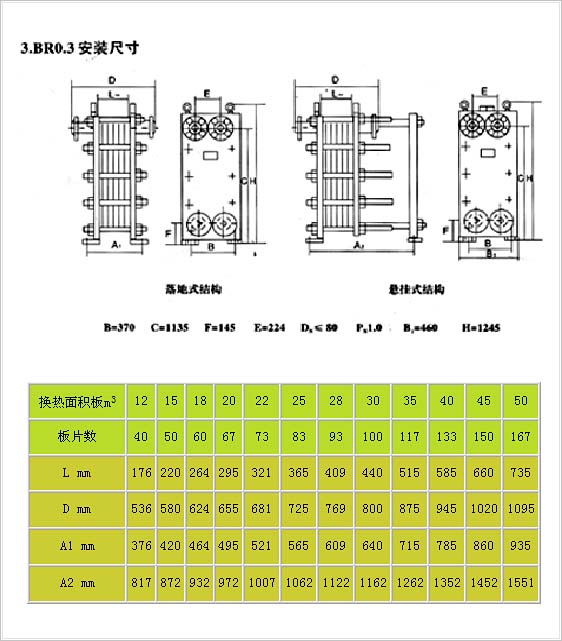 BR0.3型板式换热器是一种新型节能的换热设备。BR0.3型板式换热器主要由不锈钢压制的传热片、密封胶垫、夹紧螺栓和压紧板整机框架等零部件组成。具有换热效率高,物料流阻损失小,结构紧凑,温度控制灵敏,操作弹性大,拆装方便,使用寿命长等特点,是目前国内最先进的高效节能换热设备。 BR0.3型板式换热器可耐各种腐蚀介质,传热效率高,冷热介质通过相邻板片流经各自通道进行换热。由于板片上有人字形波纹,介质流动形成湍流, 因此获得较高的换热效率。高效节能,传热系数高。其换热系数可达3000-4500kcal/m2.゜C.h.是相同流速下管壳式换热器的3倍以上。使用安全可靠,结构紧凑,体积小,占地少,是同等换热面积管壳式换热器的五分之一左右。 BR0.3型板式换热器组合灵活,调整维修方便,松开压紧螺母即可进行清洗维护(可参考板式换热器设备清洗要点),更换胶垫或板片。板式换热器板片均为独立元件,可按用户要求随意增减换热面积和流程。密封槽设置泄液液道,各种介质不会串通,即使出现泄漏,也是向外排出。 BR0.3型板式换热器各个部件的功能: BR0.3型板式换热器订货须知: