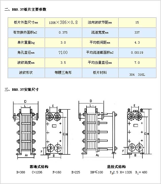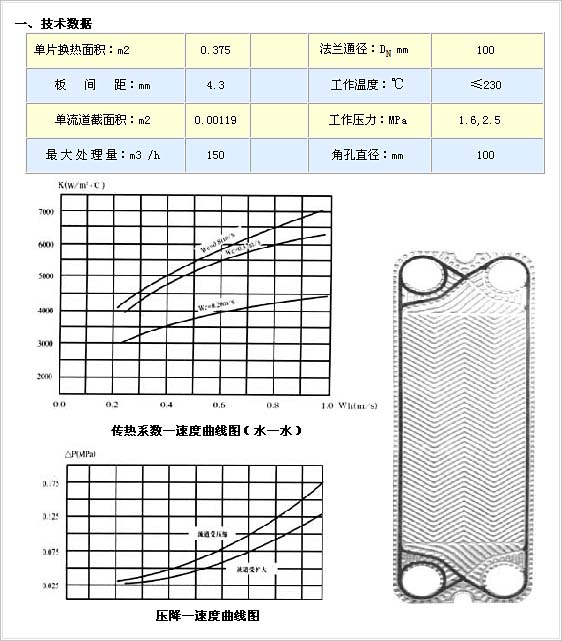 供应BR0.37板式换热器我厂生产的BR型板式换热器主要由不锈钢压制的传热片、密封胶垫、夹紧螺栓和压紧板整机框架等零部件组成。具有换热效率高,物料流阻损失小,结构紧凑,温度控制灵敏,操作弹性大,拆装方便,使用寿命长等特点,是目前国内最先进的高效节能换热设备。 BR0.37型板式换热器可耐各种腐蚀介质,传热效率高,冷热介质通过相邻板片流经各自通道进行换热。由于板片上有人字形波纹,介质流动形成湍流, 因此获得较高的换热效率。高效节能,传热系数高。其换热系数可达3000-4500kcal/m2.゜C.h.是相同流速下管壳式换热器的3倍以上。使用安全可靠,结构紧凑,体积小,占地少,是同等换热面积管壳式换热器的五分之一左右。 BR0.37型板式换热器组合灵活,调整维修方便,松开压紧螺母即可进行清洗维护(可参考板式换热器设备清洗要点),更换胶垫或板片。板式换热器板片均为独立元件,可按用户要求随意增减换热面积和流程。密封槽设置泄液液道,各种介质不会串通,即使出现泄漏,也是向外排出。 BR0.37型板式换热器常见故障的处理: BR0.37型板式换热器订货须知: