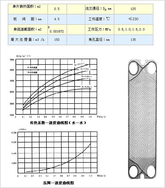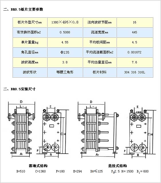 BR0.5型板式换热器主要由不锈钢压制的传热片、密封胶垫、夹紧螺栓和压紧板整机框架等零部件组成。具有换热效率高,物料流阻损失小,结构紧凑,温度控制灵敏,操作弹性大,拆装方便,使用寿命长等特点,是目前国内最先进的高效节能换热设备。 MK体育app体育app网站网址 可耐各种腐蚀介质,传热效率高,冷热介质通过相邻板片流经各自通道进行换热。由于板片上有人字形波纹,介质流动形成湍流, 因此获得较高的换热效率。高效节能,传热系数高。其换热系数可达3000-4500kcal/m2.゜C.h.是相同流速下管壳式换热器的3倍以上。使用安全可靠,结构紧凑,体积小,占地少,是同等换热面积管壳式换热器的五分之一左右。 MK体育app体育app网站网址 组合灵活,调整维修方便,松开压紧螺母即可进行清洗维护(可参考板式换热器设备清洗要点),更换胶垫或板片。板式换热器板片均为独立元件,可按用户要求随意增减换热面积和流程。密封槽设置泄液液道,各种介质不会串通,即使出现泄漏,也是向外排出。 MK体育app体育app网站网址